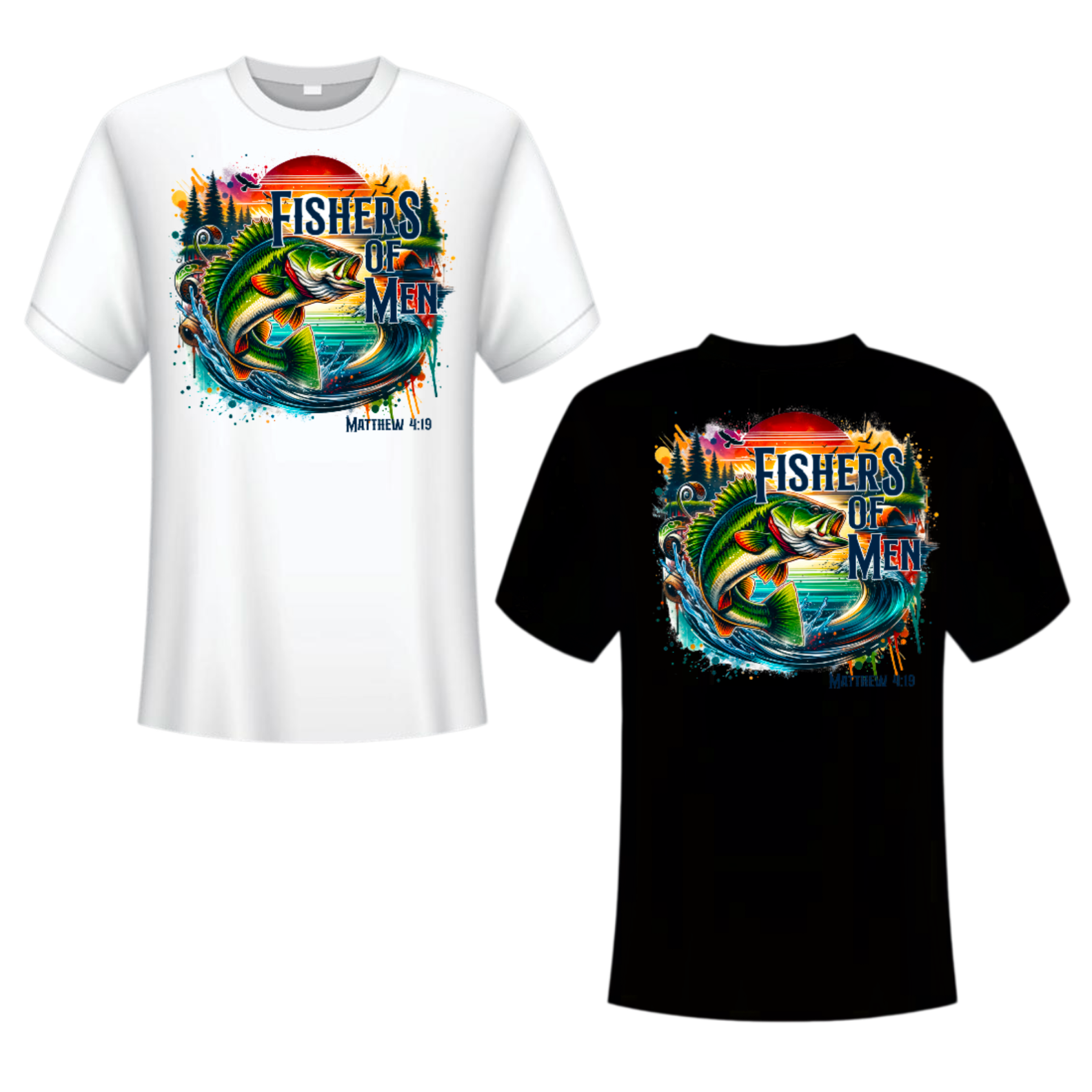 Answer the call with bold faith and outdoor spirit in this striking “Fishers of Men” T-shirt, inspired by Matthew 4:19. Featuring a dynamic bass fish leaping from vibrant waters against a vivid sunset backdrop, this shirt combines the passion of fishing with the mission of discipleship.
